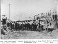 GB 088 "The 'Twin Falls Spirit' - Citizens Donate Services to Help Finish Electric Railway to Shoshone Falls;" a group of men in dress shirts and hats pose with tools in and on the sides of a depression in the road. {Though attributed to the July 1914 article in "See Idaho First," this is not accurate.} -