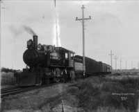 B 027 "R. R. Yards. Jerome, Idaho;" train with a 3-man crew; railroad track is lined with power poles -