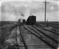 B 029 "First Passenger Train - Barrymore, Idaho. August 9, 1911;" a couple of men stand alongside the train as it sits on the railroad tracks, southeast of Jerome, Idaho. -
