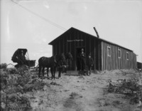 B 130 "Grant's Hospital; North Side 1909;" a tarpaper building. A man and boy stand in front, while another man sits in a buggy driven by two horses looks on. -