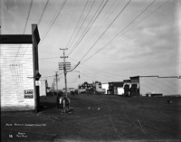 B 127 "Main Street, Jerome, Idaho, 1909;" view down the street. Visible businesses include: the land office; a furniture store, Haddock Land Co; Jerome State Bank; Ott's Lunch Room, a meat market, and a bakery. The North Side Inn is in the center background. -