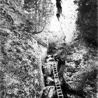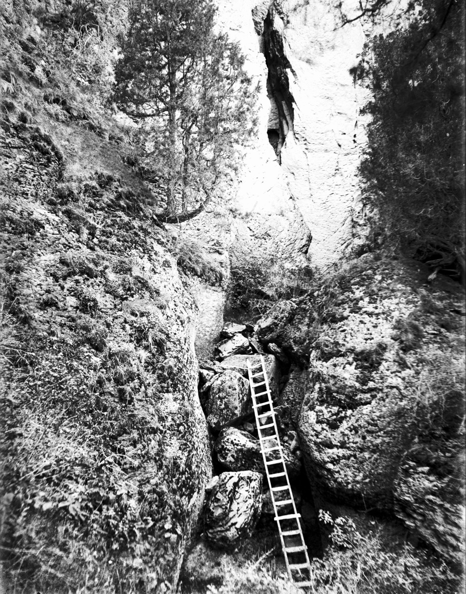 - A ladder propped against rocks in a crevice of a canyon wall, likely near Shoshone Falls.