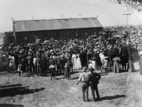 1952 A large group of school children posed at the side of the first school in Twin Falls.