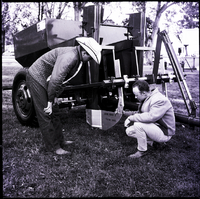 KEL 286 Two men look over a piece of equipment at the Twin Falls County Fair. One man, dressed in a cowboy hat, jacket, and boots, kneels over, while the other man is crouched down looking at a metal piece of the machine that reads "Acme Rock & Trash Shoe." Some trees are in the background.