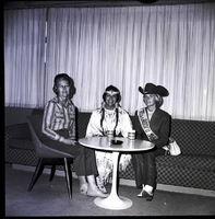 KEL 287 From left to right, Mrs. Harold Hove, mistress of ceremonies, Michele Ann Portwood, Miss Indian America, and Harriet Sharp, Miss Rodeo Idaho, are gathered around a table at the Blue Lakes Country Club during a luncheon honoring national, state, and local rodeo queens sponsored by the Twin Falls Bank and Trust Co., Fidelity National Bank, and First Security Bank of Idaho. Mrs. Hove, dressed in a western-style shirt, is seated in a chair, while Miss Portwood, dressed in traditional Native American clothing, and Miss Sharp, dressed in a cowboy hat and "Miss Rodeo Idaho" sash, are seated on a checkered couch. On the table in front of them are two mugs and an ashtray. Curtains hang across the windows behind them.