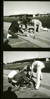 KEL 279 Members of the Interact Club paint the curb in front of Twin Falls High School as a school service project. The Interact Club, who are sponsored by the Rotary Club, plan to erect a marquee to announce school events for their next service project. The high school building is visible in the background. Sprinklers are running on the high school lawn.
