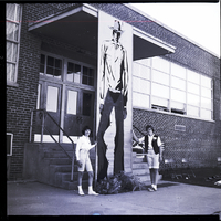 KEL 278 Claudia James, left, and Carolyn Reinke, right, stand outside the Memorial Lutheran Church for the Walther League Convention beside "Big Sam" the cowboy. The large banner of the cowboy hangs from the overhang in front of the stairs leading to the front entrance of the church, and the two girls, who constructed the display, rest a hand on it. A pile of sagebrush sits on the ground under the banner. Some folding chairs and the side of the school, with an opened window, are in the background.