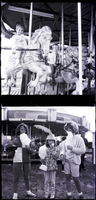 KEL 282 In the top image, from left to right, Becky Johnston, Betty Johnston, and Jana Roesler ride the carousel at the Twin Falls County Fair. In the bottom image, three girls stand in front of the carousel, eating cotton candy. Two of them are wearing embroidered hats with a long feather sticking out of them, and the other girl has rollers in her hair and is wearing a bonnet over them. The center girl has "Peggy" embroidered on her hat, and she's holding a small purse.