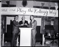 KEL 221 State officers Virgil McKenzie, Weldon Haskins, and William S. Hawkins stand behind a podium at a BPOE convention held in Twin Falls. Mr. McKenzie hands Mr. Hawkins a gavel. All three men are dressed in suits and ties. Three large plush chairs are behind the men. Some chairs and an ashtray are in the corner. On the back wall is a display that reads "1183 In Memoriam." Hanging from the ceiling above the men is a string of pennants and a banner that reads "Come and Play the Kellogg Way Midwinter Convention '66." An elk head is mounted high on the wall in the background.
