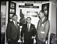 KEL 229 From left to right, Chet Stahl, chairman of the hospital board, DeLoy Giles, patient of the Elks Rehabilitation Center, and Weldon Haskins, Elks state president, stand in front of a display for the Idaho Elks Rehabilitation Center at a BPOE convention held in Twin Falls. The men are dressed in suits and ties, and Mr. Giles holds a cane. Mr. Giles, who lived at the Elks Rehabilitation Center in Boise on and off for fifteen years after being almost completely paralyzed in a logging accident when he