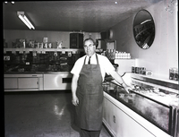 KEL 230 M. Sherman Swensen, owner-manager of Swensen's Food Center, checks dairy products at his newly-opened store in South Park. The Food Center is located at the site of the Okay