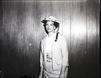 KEL 045 Winner of the most original hat at the Welcome Wagon Newcomers Club luncheon meeting was Mrs. James Spafford. The hat is covered in capsule and tablet medications of various sizes. Some pill boxes also decorate the hat. Mrs. Spafford is wearing a dress suit, and standing beside a table that has some ashtrays and a purse on it.