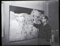 KEL 039 Gerald Larson, new Soil Conservation Service Chief at Burley, looks over a map of Cassia County. In the background is a bookcase with several books. Book titles include "Cassia Creek Reservoir Company," "Soil: The 1957 Yearbook of Agriculture," "Land: The 1958 Yearbook of Agriculture," "Seeds: The 1961 Yearbook of Agriculture," "After a Hundred Years," "A Place to Live: The 1963 Yearbook of Agriculture."