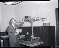 KEL 041 County clerk Harold Lancaster, dressed in a suit and tie, loads film into a new camera which will be used to microfilm Twin Falls county records at the county court house. A wall of file cabinets is behind the camera.