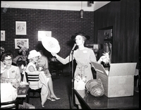 KEL 046 Guest speaker Mrs. Esther Allred, a custom hat designer, spoke on hat making techniques and described many of the latest fashions at the Welcome Wagon Newcomers Club luncheon meeting held at the Depot Grill Caboose room. Mrs. Allred stands behind a microphone, and there is a box and several hats sitting on a table beside her. She holds up a hat, displaying it as she speaks. Attendees seated at long tables enjoy food and coffee during the talk. A jukebox and an open closet are in the background. Several art prints hang on the brick wall.