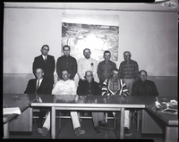 KEL 053 Ten men, members of the Twin Falls Cattlemen Association, gather around a table. C. W Daigh, Don Ramseyer, and Tom Callen are in attendance. Some papers and ashtrays are on the table. A large photograph of Shoshone Falls hangs on the wall behind them.