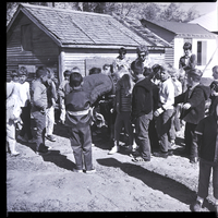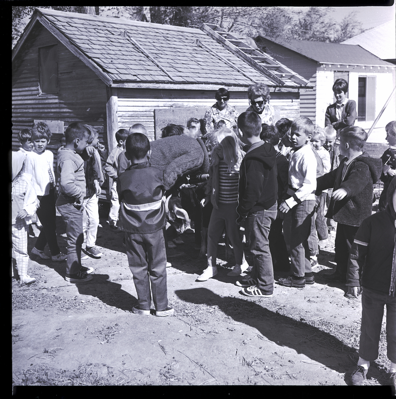 Mrs. Cleo Shorthouse's kindergarten classes visit the Kenneth Walker farm. Several children surround a goat shown by Mrs. Kenneth Walker. Behind the group is a barn that has some hoes and a ladder laying on the roof, and a farmhouse. Several trees are in the background.