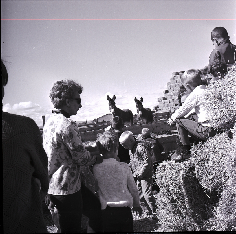 Mrs. Cleo Shorthouse's kindergarten classes visit the Kenneth Walker farm. A group of children sit on a stack of hay bales and stand in front of a fence looking at some donkeys in a pen. Mrs. Kenneth Walker stands by, supervising.