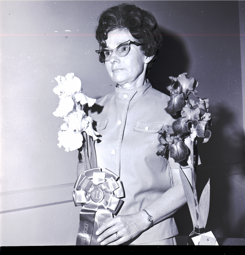 Mrs. Ed Conrad holds up a vase of light-colored irises at an iris show sponsored by the Magic Valley Iris Society and held at the Twin Falls YMYWCA. Mrs. Conrad was the second sweepstakes winner and received the AIS bronze medal certificate for second greatest number of cultural firsts. On the vase is the award ribbon from the Iris Society. On the table beside her is a vase of dark-colored irises.