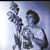 Mrs. Albert Toberer holds a vase of irises titled "Beth Corey" in one hand and a purple rosette award ribbon for best stalk that reads "American Iris Society Best Specimen of Show" in the other hand at an iris show sponsored by the Magic Valley Iris Society and held at the Twin Falls YMYWCA.