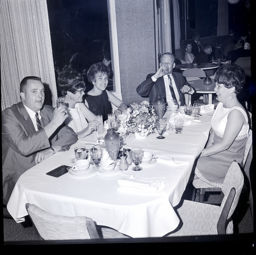 Members of the Welcome Wagon Newcomers Club enjoy drinks during a formal club dinner-dance held at the Blue Lakes Country Club. From left to right are Frank Overand, Mrs. Frank Overand, Mrs. Jim Curtright, Jim Curtright, and Mrs. Max Euteneier. The table is covered in a white tablecloth, and several cups, some candle holders, and a centerpiece of flowers is on the table. Some other diners are seen in the background.
