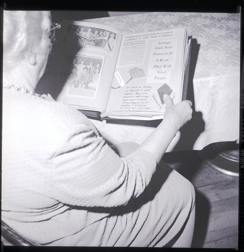 The annual Syringa Club Girls State sessions are sponsored by the American Legion Auxiliary. Mrs. W. W. Noble served as Girls State chairman for Twin Falls. She sits at a table looking at a scrapbook. Inside the scrapbook are some newspaper articles and pictures. The headlines read "Girls Staters Elect Mayors of Nine 'Cities'," "Parliamentary Rules, City Government Explained as Girls State Continues," and "Syringa Girls State Proves To Be a Week They Will Never Forget."
