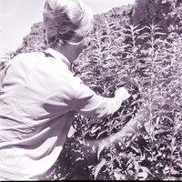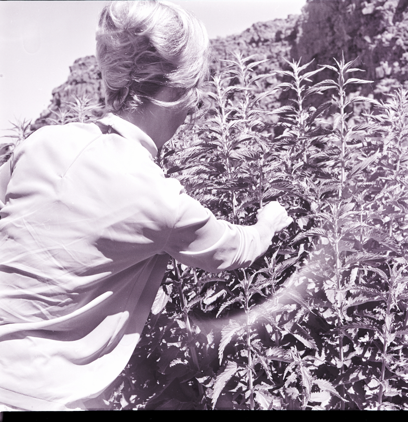A woman picks stinging nettles in a weed patch in the Snake River Canyon. Rocky canyon cliffs are visible in the background.