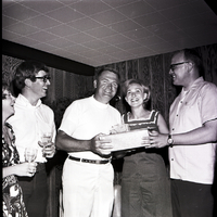 - A man hands Mr. and Mrs. Horney a wrapped present at their farewell party held at the home of Tommy Walker. A couple holding drinks stand to the right, laughing.