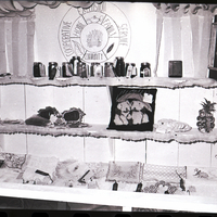 A booth for the extension council is on display at the Gooding County Fair. Inside the booth is a display of antiques, jar of canned preserves, loaves of bread and other foods, crafts, and embroidered cloth and pillows. Several of the items have award ribbons. At the back of the display is a sign that reads "Cooperative Extension Service, Home, Family, Community." Some banners decorate the top of the display.