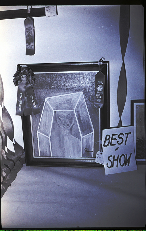 - A painting of a human figure behind an octagonal frame wins a Best of Show award at the Jerome County Fair. Several award ribbons hang from the frame. Some streamers decorate the wall around the painting.