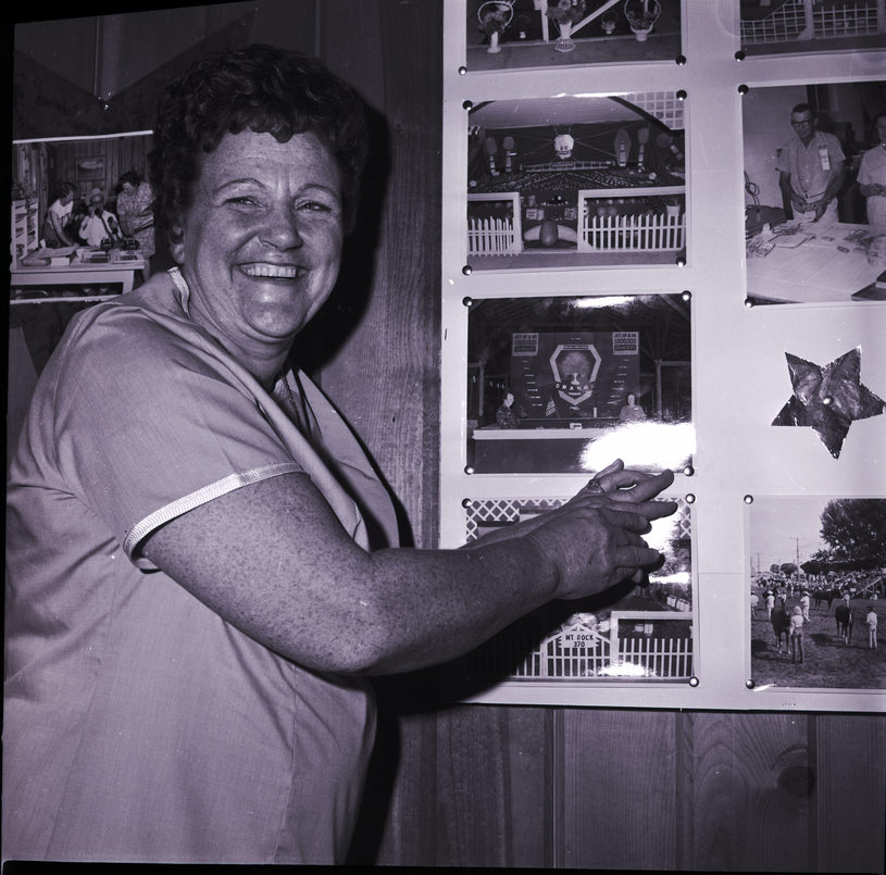 - Mrs. Don Albin stands beside a poster in an office displaying photographs of different booths at the Twin Falls County Fair. She creates unusual and attractive decorations for fair-related events.