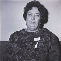 - Mrs. Orville Sackett, superintendent of youth for the Twin Falls County Fair, stands beside a wall. She is wearing a floral-print blouse with a name tag pinned onto the front.