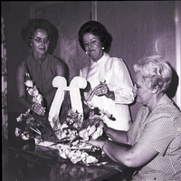 Announcing plans for the Twin Falls Music Club's annual Garden Membership Tea to be held at the Twin Falls YM-YWCA and hosted by the unit's past presidents are, from left to right, Mrs. Don Heller, treasurer of the past president's group; Mrs. Clayta Christensen, decorations chairman; and Mrs. John Birrell, president of the past president's group. The members work on a centerpiece for the event that features a small lyre sculpture surrounded by an arrangement of flowers.