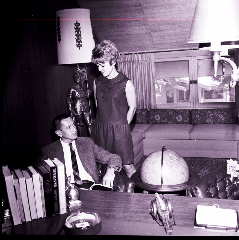 A favorite room enjoyed by Mr. and Mrs. Jerry Shane is Mr. Shane's office and den. The Shane home will be one of the homes featured in the upcoming Tour of Homes sponsored by the Twin Falls Junior Club. Mr. Shane sits in a chair with an open book on his lap, and Mrs. Shane stands beside him. In front of Mr. Shane is a desk, and on the desk are some books, a book stand, an ash tray, a daily calendar, and a model of a cannon. Beside the desk is another chair and a large globe. In the corner of the room is a lamp with a base that is a statue of a soldier in armor. A wrap-around couch is at the back of the room.