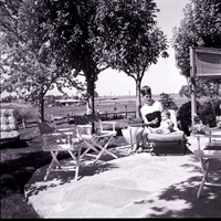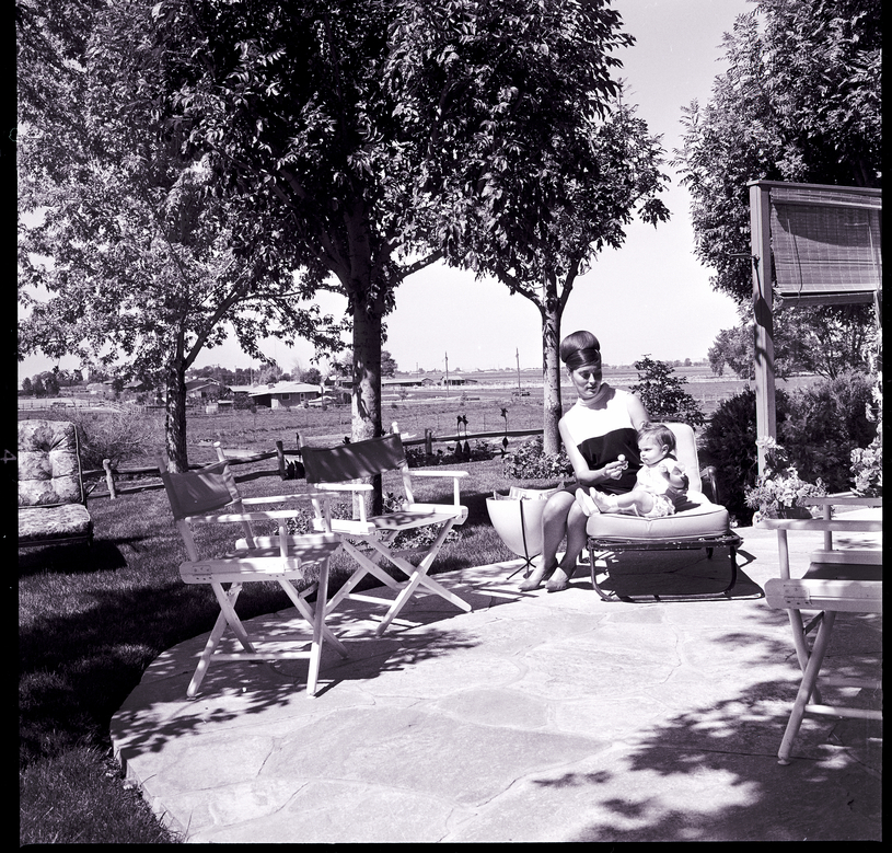 Taking advantage of the gorgeous patio at the R. P. Parry home is Mrs. John Rosholt and her daughter, Becky. Mrs. Rosholt is head hostess for the Junior Club at the Parry home for the upcoming Tour of Homes. She sits with her daughter on a lawn chair. Several folding director chairs decorate the patio. A chair and several large trees are in the backyard. Around the backyard is a wooden fence, and some fields and houses are visible beyond it.