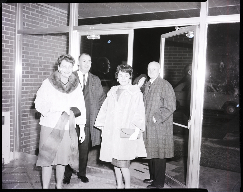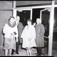 Attending opening night of the Dilettante Group of Magic Valley's production of the musical "Can-Can" held at the Filer High School auditorium are, from left to right, Mrs. Al Westergren, Jack Threlkeld, Mrs. Jack Threlkeld, and Al Westergren. The men are dressed in suits and ties with long coats, and the women wear dresses and fur coats. A car can be seen waiting outside in the background.