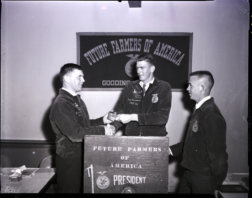 Outgoing Gooding chapter FFA president Joe Leeper hands a gavel to new chapter president Gene Wilkins. Randy Byers, state FFA vice president, observes the proceedings. They are dressed in suits and ties and their FFA embroidered jackets, and stand behind a podium reading "Future Farmers of America President." Behind the podium is a banner on the wall reading "Future Farmers of America Gooding."