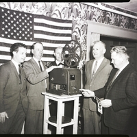 Attendees of the Idaho Cattle Feeder's Association meeting surround a film projector at a premier showing of a new movie produced by the Union Pacific Railroad, "Beef Rings the Bell," which featured many scenic range shots of the Stanley Basin area. From left to right are Sam Grayson, U.P. special representative, Boyd Baxter, U.P. agriculture agent, Ed Arnold, association president, Henry Jones, association director, and Russ Lindstrom, association director. An American flag is displayed on the wall behind the projector.