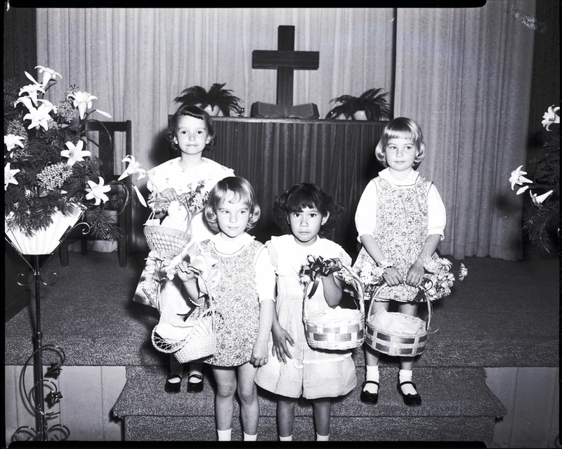From left to right, Doralee Welch, Judy Stepanovich, Anita Hernandez, and Jody Stepanovich carry May baskets for offering at the United Church Women's May Fellowship luncheon at the Church of the Brethren. The little girls are all wearing dresses. An African American man, Bob Nora, dressed in a suit and tie holds the handle of one of the baskets. Flower pots filled with lilies decorate the sides of the stage. A display with a cross is in the background.