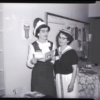 Speakers at the United Church Women's May Fellowship luncheon include, from left to right, Mrs. W. R. Hatcher, state president of the Christian Women's Fellowship and local magazine chairman for United Church Women, and Mrs. Richard Barton, local president of the United Church Women. They are wearing dresses and hats look at "The Church Woman" magazine in a hallway at the Church of the Brethren. A sign on the wall behind them reads "The Church Woman Subscribe Here." The table beside them have several copies of the pamphlet and a placard reading "Race - The New Challenge. 21st Annual Institute of Race Relations June 29 - July 11, 1964. Fisk University." A bookcase filled with books and a display table are in the background.