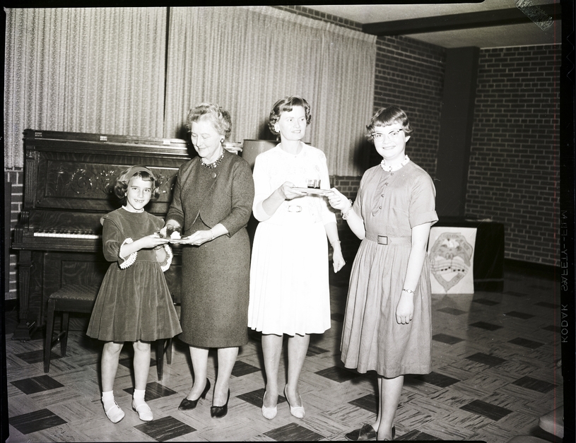 - An elderly woman and a little girl hold a saucer and tea cup at the Junior Music Club Gold Cup recital and social hour. Beside them a woman and a teenage girl also hold a saucer and tea cup. A piano and a poster with some music notes are in the background.