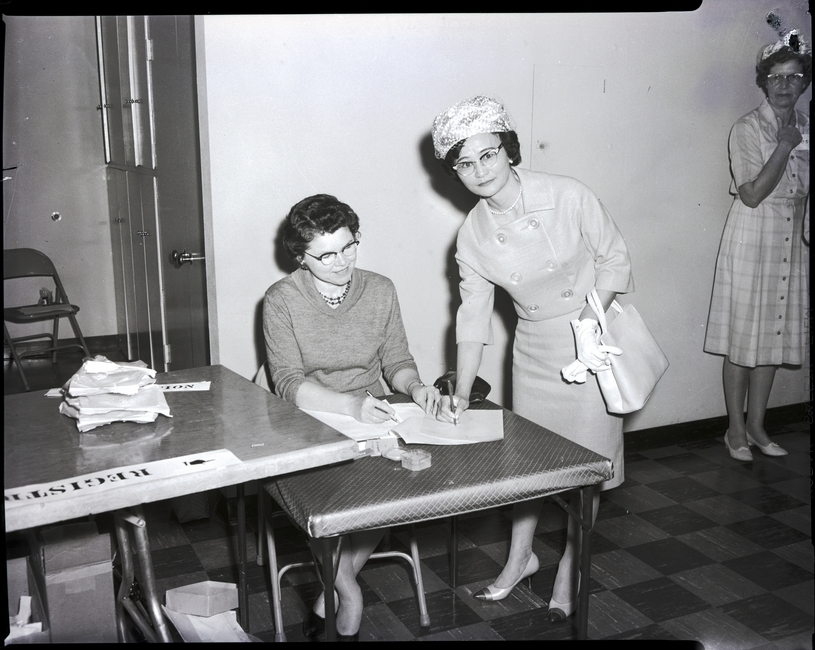 Registering at the South Central Home Demonstration Council meeting held at the Methodist church is Mrs. Roy Hondo, Cassia county council president, right. She is dressed in a dress, hat, and white gloves. Mrs. Harvey Maxon, Twin Falls county treasurer, is directing the registration. She sits behind a table, holding a pen and looking at some forms. A table to the side reads "Registration." Syringa Club members were in charge of the registration. Another woman stands in the background.