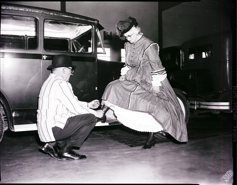 Ben R. Box fixes his wife's high-buttoned shoe next to an old car at a Horseless Carriage Club tour and old-time fashion show. Mrs. Box is wearing a dress, petty coat, and bonnet, and Mr. Box is wearing a striped shirt, slacks, and a bowler hat. Another car is seen in the background.