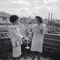 Preparing a floral arrangement are Mrs. William Davis, left, and Mrs. Harold Gerber, right,co-chairmen of the annual Junior Club May Tea. They are wearing dress suits and gloves. Mrs. Davis holds a tall vase filled with flowering branches of blossoms. Mrs. Gerber is arranging the branches in the vase. A fence surrounds the yard, and beyond it other houses and backyards are visible in the background.
