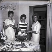Serving punch at the Junior Club May Tea is Mrs. Richard Schultz, outgoing treasurer, center, to Mrs. Warren Skinner, outgoing vice president, right, and Mrs. Pat Fleenor, projects chairman, left. On the table are several platters of cookies and pastries, a punch bowl, and a centerpiece of flowers framed by two candles. The wallpaper behind the women has a pattern of tree branches covered in cherry blossoms. The women are wearing dresses, and Mrs. Fleenor has a veiled hat.