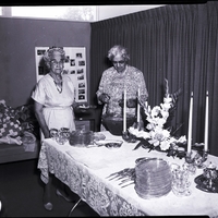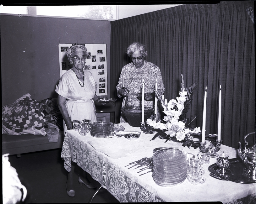 Presiding at the elaborately decorated tea table at the Morningside Club's Fiftieth Anniversary tea are, from left to right, Mrs. Vera Holland, senior active club member, and Mrs. Vernon Scribner, the only remaining charter member from Boise. Both women are wearing dresses. The table is covered in a lacy table cloth, and on the table is a a platter of cookies, a punch bowl, plates, cups, silverware, a tea set, a centerpiece of flowers, and candles. In the background is a couch with a quilt draped over it and a poster board covered in photographs.