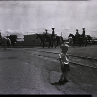 Jeffrey Leazer, two-year-old son of Mr. and Mrs. Richard Leazer, stands beside some railroad tracks at the Magic Valley Western Horse Show Parade. Five women in cowboy hats and boots ride horses in the background. A train, a woman, and some buildings and automobiles (cars) are in the background.