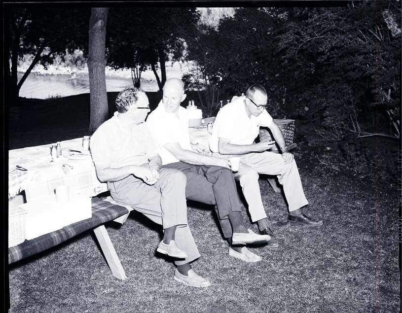 From left to right, Max Brown, Dr. George Rush, and Paul Beck sit on a picnic table bench at Dierkes Lake at a Supper Club barbecue. Dr. Rush holds a cup as he talks with Mr. Brown. The table is covered in a table cloth, and on the table are plates, silverware, condiments, and a cooler. Some picnic baskets are sitting on the table benches. Dierkes Lake can be seen in the distance behind the men. Several trees and bushes surround the area.