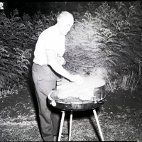 - C. P. Parrish cooks steaks on a barbecue at Dierkes Lake at a Supper Club barbecue. Several trees and bushes surround the area.
