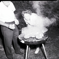 - C. P. Parrish stands beside a barbecue holding a bottle of seasoning at Dierkes Lake at a Supper Club barbecue. Mrs. C. P. Parrish stands over the barbecue grill, watching the steaks cook. Smoke billows up from the barbecue. Several trees and bushes surround the area.
